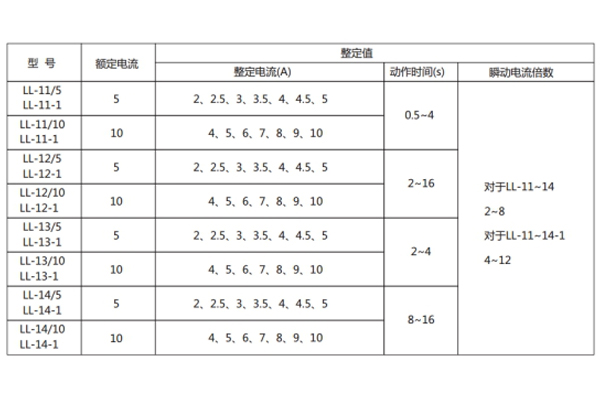 注:特殊規格LL-10-1(11-1、12-1、13-1、14-1)瞬動電流倍數4-12,其余參數與LL-10系列對應;繼電器的電流線圈允許長期通過