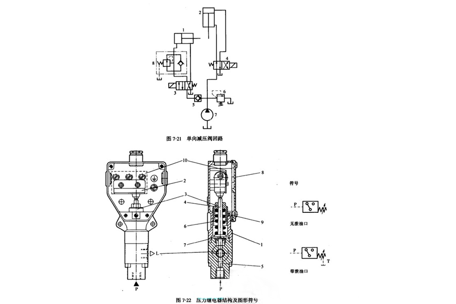圖7-22為柱塞式壓力繼電器,其組成包括閥體1、微動開關2、調整螺套3、推桿4、柱塞5、調節彈簧6等。被測壓力油由P口進人,并作用在柱塞5上。柱塞5頂壓推桿4,并克服彈簧6的作用力,壓下微動開關10的觸頭,發出電信號。轉動調整螺套3設定繼電器動作壓力,以防止壓力太高時,推桿將微動開關損壞。柱塞與推桿間設機械擋塊7,并由閥體1限位。L為泄漏油口,9為鎖緊頂絲。