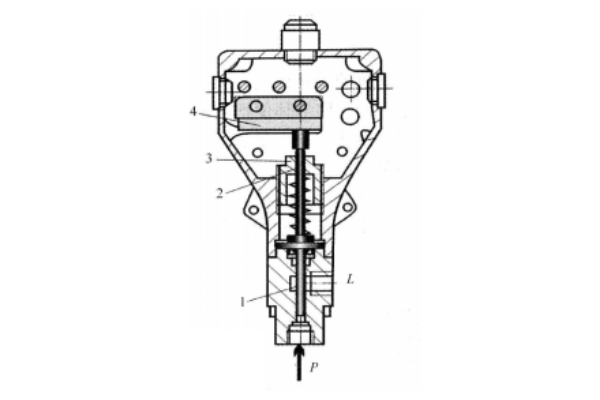 當(dāng)從繼電器下端進(jìn)油口3進(jìn)入的液體壓力達(dá)到調(diào)定壓力值時(shí),推動(dòng)柱塞2上移,此位移通過杠桿放大后推動(dòng)微動(dòng)開關(guān)4動(dòng)作。改變彈簧1的壓縮量,可以調(diào)節(jié)繼電器的動(dòng)作壓力。